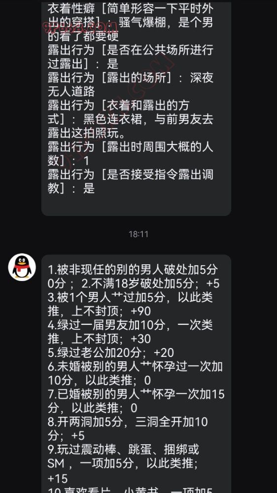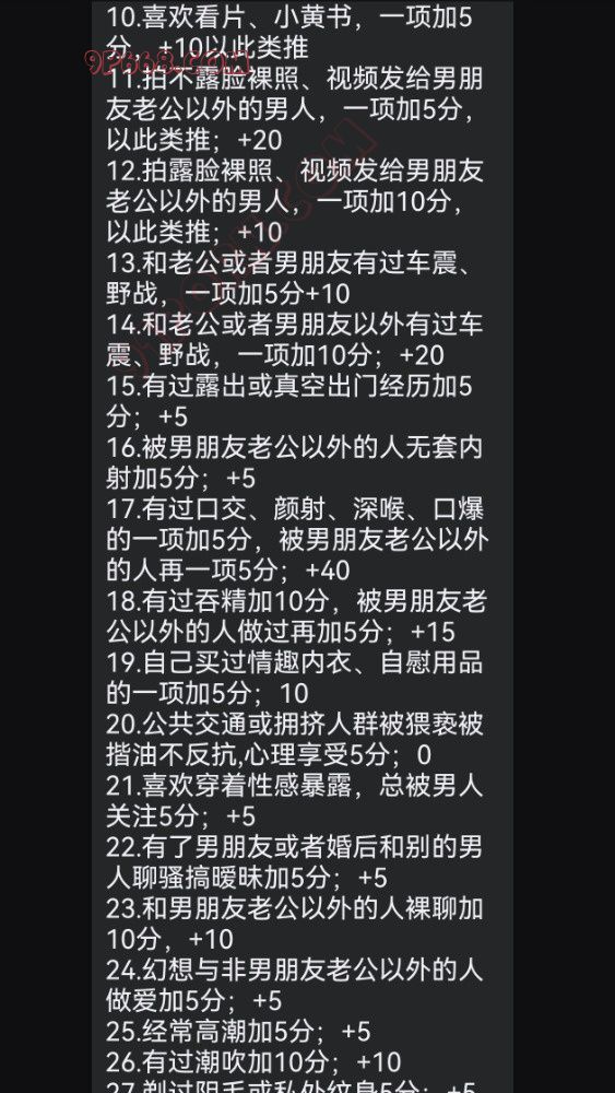 11.拍不露脸裸照、视频发给男朋友老公以外的男人,一项加5分,以此类推;